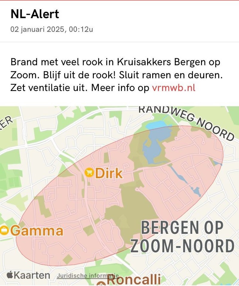 In de omgeving van de brand aan de Kruisakkers in Bergen op Zoom is een NL-Alert verstuurd.