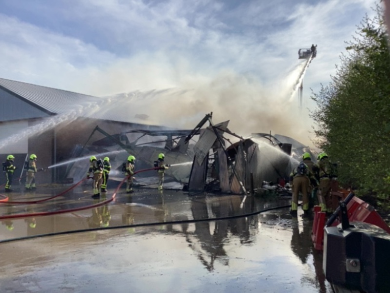 De schuur staat naast een tweede schuur met landbouwvoertuigen. Op het dak liggen zonnepanelen. De brandweer zet in om uitbreiding naar het naast gelegen pand te voorkomen.