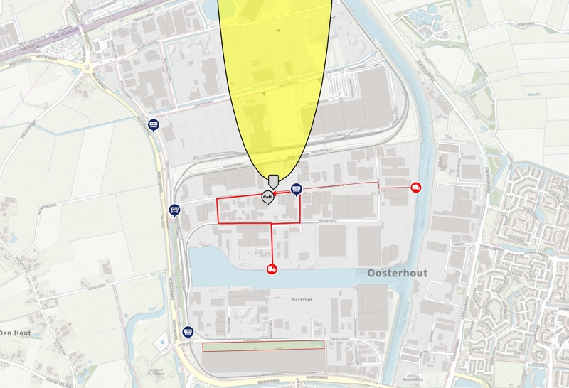 De Industrieweg, Koopvaardijweg en Rederijweg zijn afgesloten Er wordt aan een noodontsluiting gewerkt. Werknemers van bedrijven binnen en rechts van het rode vak kunnen parkeren op de energieweg